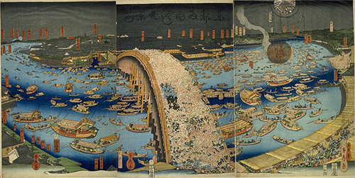 江戸の花火 Posted 2021年8月1日 by norenkanri さて、昨年に続いて今年も「花火大会」のない寂しい夏になりました。どうぞ、江戸の花火の浮世絵でお楽しみください。 描かれているのは、夜ごと花火が打ち上げられる両国です。でも、絵の主役は花火ではなく、両国橋を埋め尽くす人、人、人……。 隅田川も、花火見物のお客を乗せた舟がびっしり浮かんでいます。 なんと「密」な花火大会! 私たちも来年、楽しみましょうね。 『東都両国ばし夏景色』(三都涼之図,五雲亭貞)